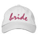 Weißer Bride Hut mit dem Wort "Braut" in rosa Stickerei. Eine passende Brautjungfrau, die auch im Laden erhältlich ist.