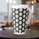 Mit einer Kaffeetasse in dieser großen, Keramik-Tasse, die das umhüllte Foto-Bild einer hübschen, weißen Daisy-Blume auf einem schwarzen Hintergrund zeigt und in einem sich wiederholenden Muster gedruckt. Ein schönes, blumengeschmücktes Design!