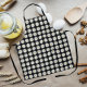 Schürze in der Küche mit einem durchdachten Druckdesign, das das Foto einer hübschen, weißen Daisy-Blume auf schwarzem Hintergrund zeigt und in einem sich wiederholenden Muster gedruckt wird. Ein schönes, blumengeschmücktes Design! Wählen Sie Ihre Schürze aus.