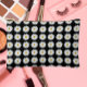 Kleine Kosmetiktüte mit Reißverschluss, die das Bild einer hübschen, weißen Daisy-Blume auf schwarzem Hintergrund zeigt und in einem sich wiederholenden Muster gedruckt wird. Ein lustiges Blumendesign! Perfekt als Reisezubehör für Make-up, Parfüm und Schmuck.
