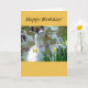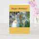 Eine niedliche weiße Ente weht am Ufer, umgeben von hübschen, gelben Narzissen. Anspielung auf den Frühling und sonnige Tage, während die Sonne auf dem Wasser am See glitzert. Eine sehr glückliche, sonnige Karte für einen schönen Geburtstag für einen Freund oder Liebsten.