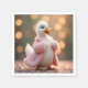 Eine fröhliche Ente mit einem flauschigen rosa Mantel steht vor einer Kulisse leuchtender Party-Lichter und Konfetti