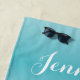 Dieses Badetuch zeigt Desteis originelle Illustration einer hübschen, weißen Frangipani-Blume mit zwei grünen Blätter. Die Hintergrundfarbe ist blau mit einem Sandmuster unten. Oben befindet sich ein personalisierbarer Textbereich für einen Namen in einem schönen Script-Schriftart.