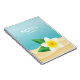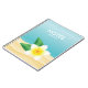 Desteis Illustration einer weißen frangipani plumeria Blume mit grünen Blätter. Die Hintergrundfarbe ist blau mit Sandtextur unten. Es gibt personalisierbare Textbereiche für den Titel des Notebooks.