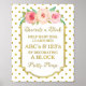 Dekorieren Sie ein Blockspiel-Schild Poster für die Babydusche in weiß-goldfarbenen Punktmustern mit goldgelben Rahmen, rustikalen pinkfarbenen und pfirsichfarbenen Blume und handgeschriebenen Stilschriften.