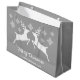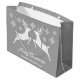Weiße Hirschformen auf Grau mit Schneeflocken und Große Geschenktüte