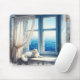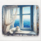 Weiße Katze auf einem Windows mit Meerblick Mousepad