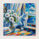 Kunstdarstellung einer weißen Katze, die aus dem Fenster auf einem Segelboot auf dem Ozean schaut. Vor der Katze ist eine Glasvase aus weißen Blume. Das wird in einem Ölgemälde gemacht. Hübsche Küstenkunst für Beach Zuhause oder um Ihnen das Meeresbrise Gefühl zu geben.