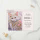 Geburtstagsfeier Einladung Postkarte mit einer schönen Illustration. Eine lange haarige weiße Katze sieht regal und elegant aus. Umgeben von rosa Blume, Gold und Diamantschmuck.