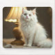 Eine flauschig weiße Hauskatze mit hellen Augen sitzt anmutig neben einer warmen, leuchtenden Lampe