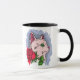 Eine weiße Katze mit grünen Augen ist im Profil dargestellt, umgeben von einer rote Rose und grünen Blätter vor blauem Aquarell