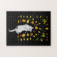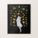 Weiße Katze mit Herbstlauben und schwarzer Hintergrundbild.