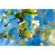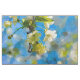 Weiße Kirschblüten blühen auf einem Baum vor dem Hintergrund der grünen Blätter und des blauen Himmels. Die Schönheit der Frühlingszeit. Ein einzigartiges Stück Stoff für Sie. Viel Spaß, kaufe einen und sei glücklich.