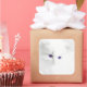 Ein zauberhaftes, weißes Kätzchen, weich und flauschig mit lila Augen. Der Hintergrund ist weich, zart und weiß.