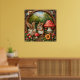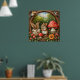Ein detailliertes Gemälde, das eine gemütliche Waldlandschaft mit einer Maus, einem Rollstuhl, einem Kornbeutel und Vögeln in einem dekorativen, runden Rahmen darstellt, alles Set in lebhaften natürlichen Farbtönen.
