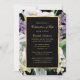 Elegante Schwarz-Gold-Blumen-Feier des Lebens Einladung mit einem goldenen Rahmen mit violetten Blumen, weißen Calla-Lilien, Orchideen und Grün. Ein Foto hinten.