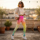Das Design zeichnet sich durch weiße stilisierte Mandalase auf einem Hintergrund mit Regenbogengradienten aus.