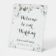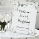 Ein dezent weißes Welcome To Our Wedding Tabletop-Schild mit einer zarten Aquarellfarbe aus weißen Ponyflöten und Eukalyptuspflanzen, die sich oben und unten befindet, mit einem handgeschriebenen schwarzen Schriftzeichen in einer Kalligraphie, das die Gäste zu Ihrer Hochzeit einlädt.