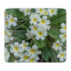 Auf dieser kleinen, dekorativen, gläsernen Schneideplatte, die das Foto kleiner, weißer Primrosen mit gelben Mittelpunkten, auch Primula vulgaris genannt, zeigt sich Ihr Essen sicher würfeln. Die perfekte Größe für das Aufschneiden von kleinen Früchten und Gemüse, Käse, etc.