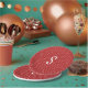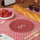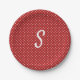 Weiße Polka-Punkte auf rotem Steppmuster-Hintergrund mit persönlichem Monogramm.