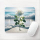 Eine einsame weiße Rose mit langen Stangen liegt mitten in einem ruhigen Strand und die Wellen stürzen sanft um den Strand.
