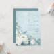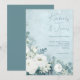Weiße Rosen Hellebores Silber Eukalyptus Blumenhochzeitseinladung mit eleganter Kalligrafieschrift moderne Wasserfarbenblumen frostiger hellblauer Hintergrund und Schneeflockendetails