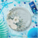 Weiße Rosen Hellebores Silber Eukalyptus Blumenhochzeit Papierplatte mit eleganter Kalligrafie Schrift moderne Wasserfarben Blumen frostig blassblauer Hintergrund und Schneeflocken Details