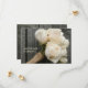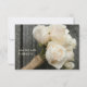 Eine Hochzeit speichern Sie das Datum mit einem Foto von einem Strauß weißer Rosen mit Stielen, die in einem Knollenwirn über einem Hintergrund von Barnwood umhüllt sind. Personalisieren Sie Ihre Veranstaltung auf Vorder- und Rückseite. com