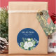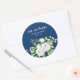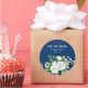 Ein schlichter, eleganter Hochzeitsaufkleber mit weißer Rose in Aquarelltönen und Blume für das Baby auf marineblau-blauem Hintergrund.