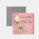Ein Magnet "Datum speichern" mit Skriptbuchstaben und Platz für Ihren eigenen Text, der mit einem hübschen weißen Rosenbügel geschmückt ist, der sich gerade auf einem cremefarbenen und staubigen rosa Hintergrund öffnet.