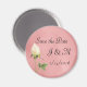 Ein Magnet "Datum speichern" mit Skriptbuchstaben und Platz für Ihren eigenen Text, der mit einem hübschen weißen Rosenbügel geschmückt ist, der sich gerade auf einem cremefarbenen und staubigen rosa Hintergrund öffnet.