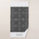 Weiße und schwarze Damast-Muster und weiße, gekalkte Rahmen Bath Handtuch Set. Das Badetuch ist mit einem eleganten, weiß-schwarzen Damast-Muster und weißen Streifen an den kurzen Seiten mit geschliffenen Kanten versehen. Es gibt auch einen Rahmen mit Ihrem Familiennamen. Das Handtuch zeigt einen geschossenen Rahmen, während das Waschtuch in der Mitte weiß mit einem Damast-Rahmen und dem Monogramm ist. Sie können es mit Ihrem Familiennamen und Monogramm personalisieren.