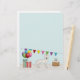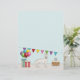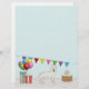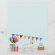 Desteis originelle Cartoon-Illustration eines niedlichen Weißschweizer Hirten / Weißfarben Deutscher Schäferhund. Der Hund ist in einer bunten Geburtstagslandschaft untergebracht. Es gibt einen Geburtstagskuchen mit ein paar Kerzen darauf, bunte Geburtstagsballons und ein buntes Banner sowie zwei Geschenkschachteln. Die Hintergrundfarbe ist hellblau.