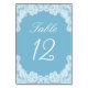 Weiße Spitze auf Pastel Blue Tischnummer