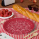 Elegantes weißes Spitzendesign mit rotem Hintergrund. Die Hintergrundfarbe kann geändert werden.