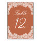 Weiße Spitzen auf der Terracotta-Tischnummer Tischnummer