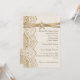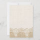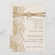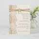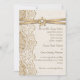 Elegante weiße Spitzen, Band und Blume auf Bräunungs-Einladung mit weißer Spitze auf Leinen natürlichen Einbruch oder Hessian mit zwei gekreuzten Satinbändern und Blume in Beige mit metallischem Glanz und einem weißen Juwel. Text in braun. Beachten Sie, dass Spitzen, Burlap, Blume und Juwel alle "bedruckt" sind und nicht echtes Gewebe, Edelstein oder Kristall. Dieses elegante, elegante und romantische Shabby Chic mit rustikalen Wesensmerkmalen ist Teil eines Hochzeitszimmers und eignet sich hervorragend für einen Country-Chic oder Western Frühjahr, Sommer- oder Herbst/Herbst Hochzeitsfeier mit einer neutralen Farbpalette.