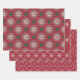 Set aus drei bedruckten Papierblättern mit verschiedenen Dekorationsmustern in passenden Farben. Jedes Blatt hat ein festliches, nahtloses Muster aus weißen Schnürschneeflocken-Ornamenten auf einem dunkelroten mosaikroten geometrischen Hintergrund.
