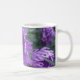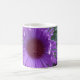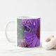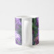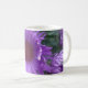 Eine weiße Tasse mit 330 ml Volumen und einem wunderschönen Blumendruck von großen lila Blüten.