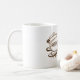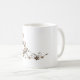 Einfache und elegante weiße Keramiktasse, verziert mit einem stilisierten grafischen Motiv, das eine Kaffeetasse, eine Untertasse und Dampfwolken darstellt. Das Design ist in schokoladenbraunen Tönen gehalten und wird durch florale Elemente und Kaffeebohnen betont, wodurch eine sowohl künstlerische als auch genussvolle Atmosphäre entsteht. Dieser Becher ist perfekt für Kaffeeliebhaber und Fans dekorativer Designs und verleiht jedem Getränk eine charmante und anspruchsvolle Note.