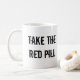 Grundlegende weiße Tasse mit Umit Logo und dem Sprichwort: Nehmen Sie die rote Pille.