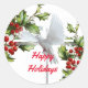 Dieser Aufkleber zeigt eine weiße Taube mit nach oben geschliffenen Flügeln, die über ein weißes Kreuz mit roten Beeren und grünen Blätter fliegen und in einem dekorativen Kalligraphie-Schriftart "Frohe Weihnachten".