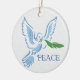 Dieses runde Metall-Weihnachtsschmuck hat eine weiße Taube mit einem Olivenzweig und das Wort "Frieden".