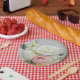 Weiße Torfbäume mit aprikotfarbener Rose Pappteller