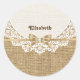 Weiß doily mit Spitzen und Leinen natürlichen Burlap-Design, die eine weiße Runde doily mit Spitze auf Leinen natürlichen Burlap mit Band und Bogen in Beige mit metallischem Effekt und ein weißes Juwel. Text in braun. Beachten Sie, dass Spitzen, Burlap, Blume und Juwel alle "bedruckt" sind und nicht echtes Gewebe, Metall, Edelstein oder Kristall. Dieses elegante, raffinierte und romantische Design mit rustikalem Wesen ist vollständig anpassbar und kann personalisiert sein.