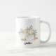 Eine Tasse mit extravaganten Wasserfarben weißen Kürbis mit Akzenten von Imitaten goldenen Glitzer. Umgeben von grünen Blätter und rosa wilden Blume.