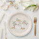 Papier Teller mit extravaganten Wasserfarben weißen Kürbis mit Akzenten der Imitate Gold Glitzer. Umgeben von grünen Blätter und rosa wilden Blume.