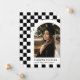 Diese moderne und einzigartige Ankündigung des Abschlusses zeigt einen schwarz-weiß karierten Hintergrund, der ein gerahmtes Foto des Absolventen in einem weißen Bogen mit dem Namen und der Schule des Absolventen unterstreicht. Eine kleine Gradationskappe wird im überprüften Hintergrund des Abschlusses des Absolventen geschickt angezeigt. Der Rücken hat einen lustigen, passenden, kontrollierten Muster im gleichen Weiß und Schwarz.