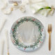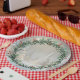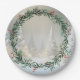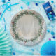 Weihnachtsbäume mit weißem Schnee und einem festlichen roten und grünen Kranz.