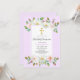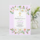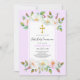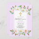 Weiße und rosa wilde Hunde Rose Lavendel lila Blumenmädchen Erste Heilige Kommunion Einladung. Dieses Design umfasst Garnflächen von Rose in Aquarelltönen, Rosa und Weiß, mit grünen Blätter am oberen und unteren Teil und einem Text in einem Rahmen. Der Rücken ist lavender.